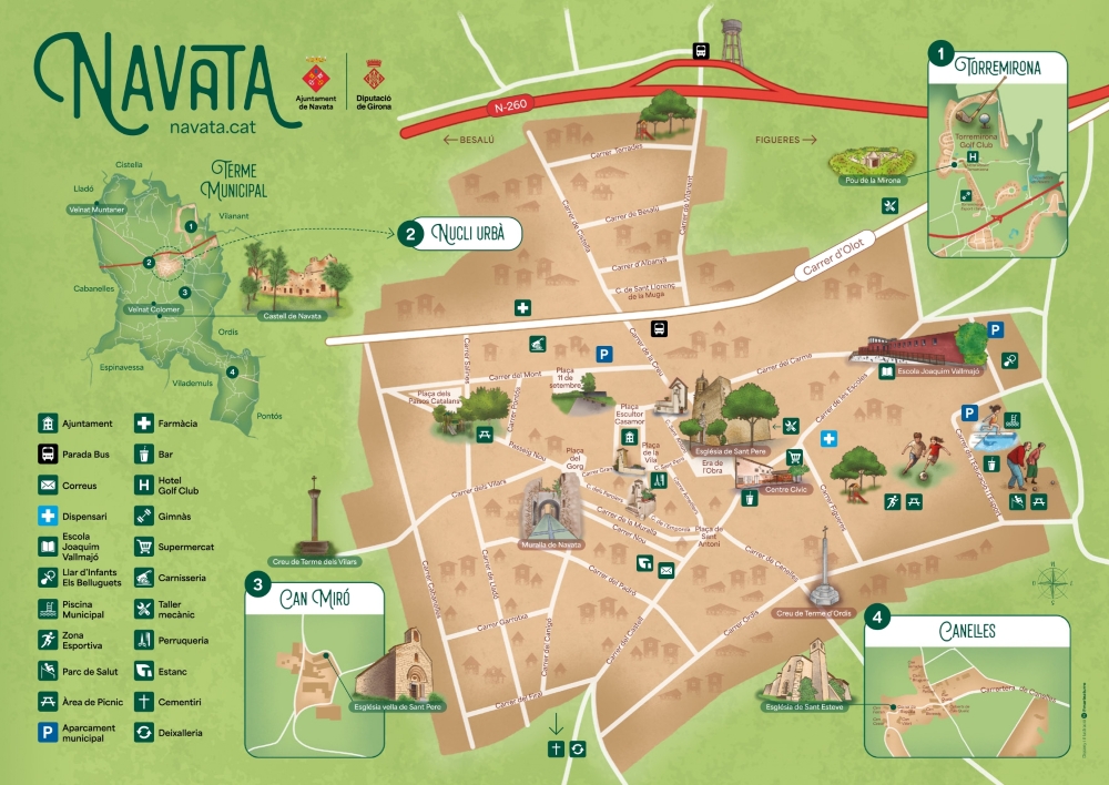 El mapa també recull tot el terme municipal amb els seus veïnats, mostrant la diversitat i bellesa del nostre entorn rural. Una manera perfecta de conèixer Navata en tota la seva amplitud.