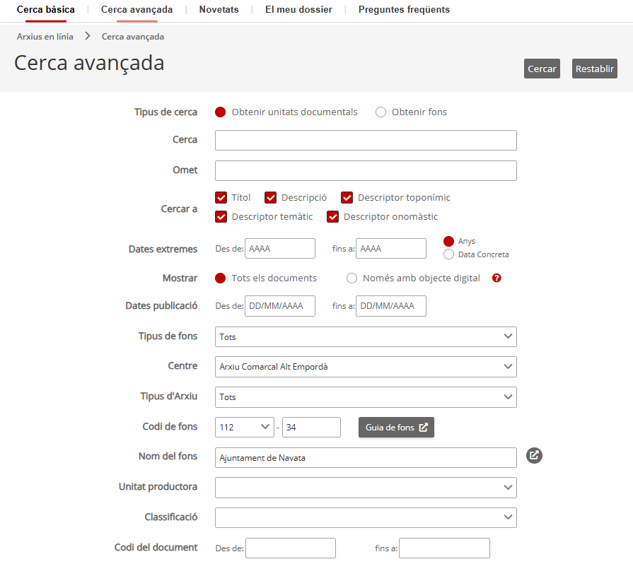 La cerca avançada us permet cercar també per text lliure, com en la bàsica, però afinant-la. Aquí podeu cercar únicament entre els documents de l’Arxiu Municipal de l’Ajuntament de Navata: per a fer-ho a “Nom de fons” heu d’escriure i seleccionar “Ajuntament de Navata”.